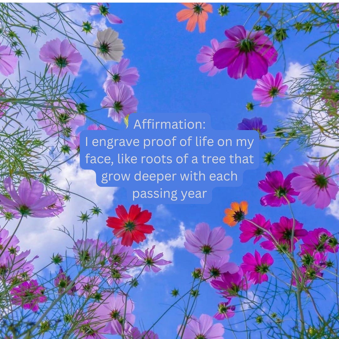🌷Affirmation: I engrave proof of life on my face, like the roots of a tree that grow deeper with each passing year.