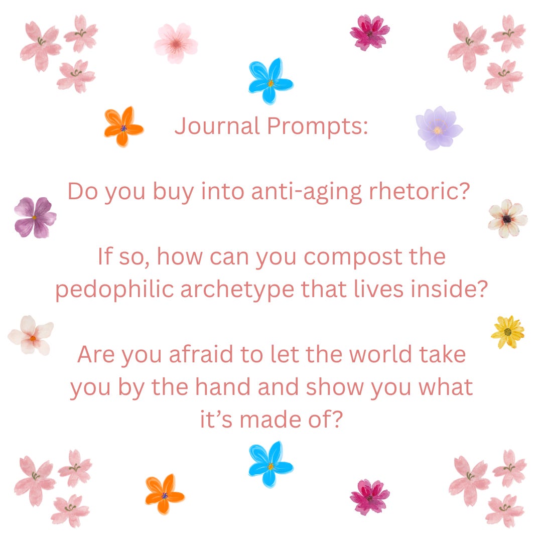 🌼 Journal Prompts: Do you buy into anti-aging rhetoric? If so, how can you compost the pedophilic archetype that lives inside? Are you afraid to let the world take you by the hand and show you what it’s made of?